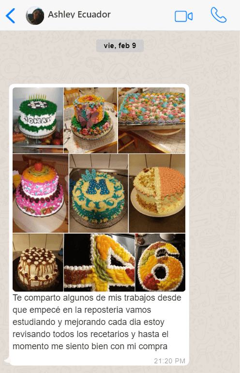 “Desde que empecé con el e-book he mejorado muchísimo mis tortas. Todos los días aprendo algo nuevo y reviso los recetarios. Me siento muy feliz con mi compra.”