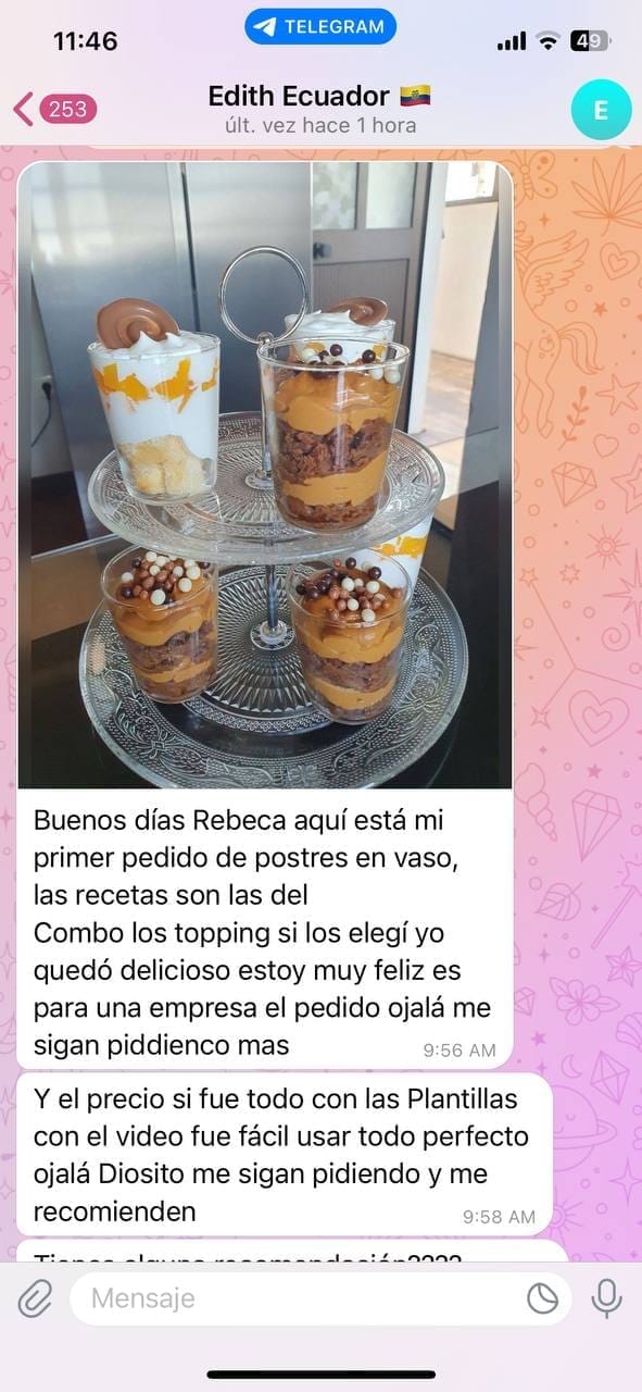 “Hice mi primer pedido de postres en vaso usando las recetas del combo. Quedaron deliciosos y ya me están pidiendo más. Todo fue fácil gracias a las plantillas y el video.”