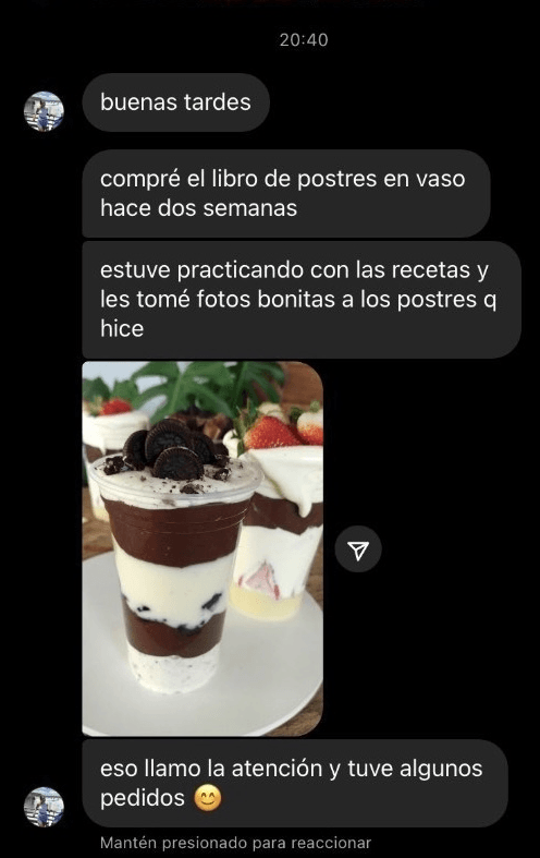 "Por fin encontré recetas actuales y bien explicadas. Los sabores, las capas y las combinaciones están increíbles. Mis clientes aman los postres y ahora vendo mucho más porque se ven realmente profesionales. Realmente vale la pena."